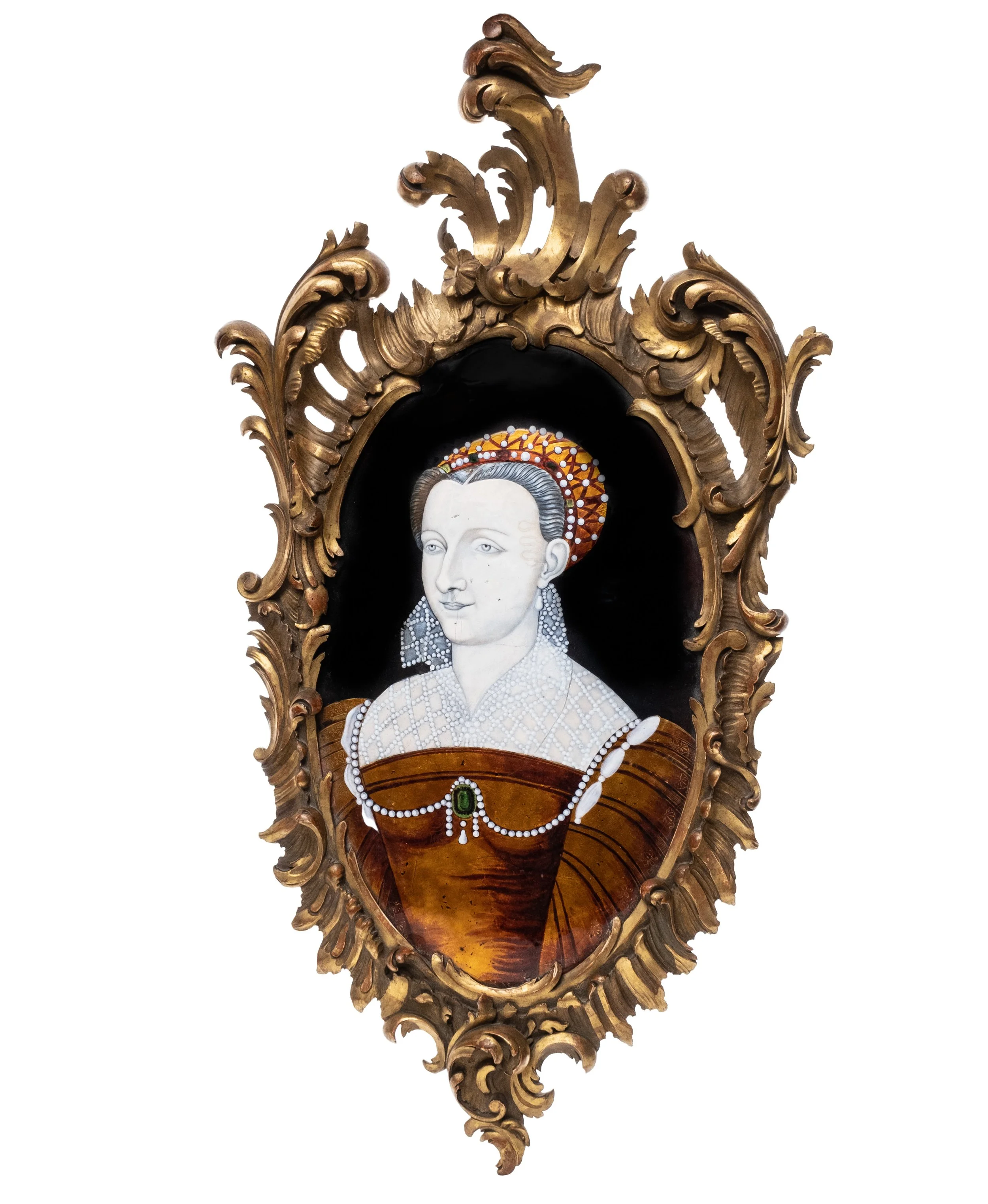 An early, large portrait, likely of Anne d'Este or Catherine of Lorraine from the 16th Century, attributed to Léonard Limosin. This exquisite piece surpasses a similar, smaller variant housed in the British Museum. With exceptional enamel work, its measurements are 44.5"H x 24"W framed. The frame, embellished with genuine gold leaf, might date back to the 18th century.