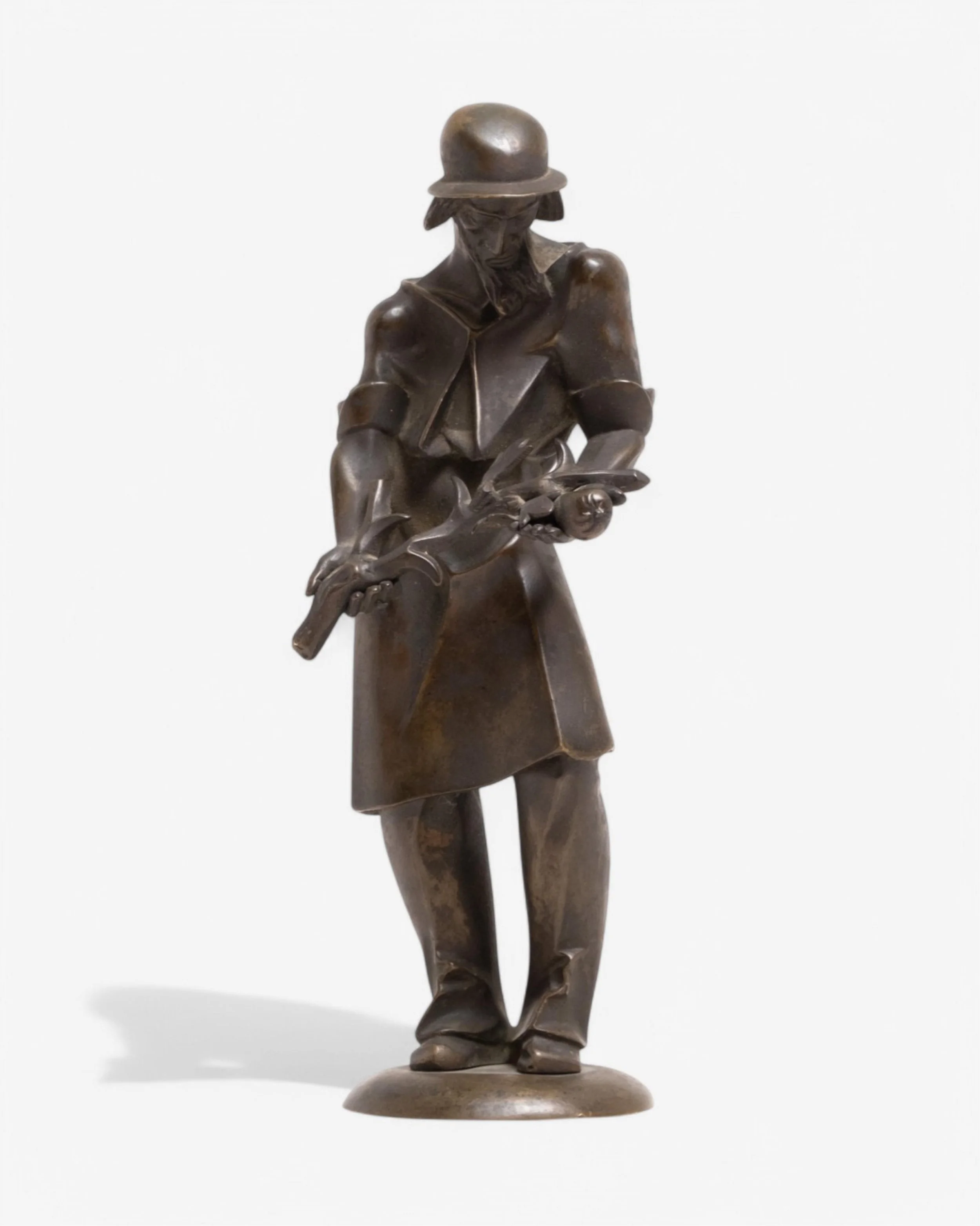 Vonka’s idiom fuses expressionism (muscular contours, dynamic silhouettes) with Art Deco and cubist geometries (faceted planes, architectonic rhythm). The result is neither pure sculpture nor mere ornament: his figures feel forged as much as modeled, a sensibility that travels naturally between a chandelier pendant, a gate finial, and an independent statuette. Polish sources emphasize how his oeuvre “bridges decorative and fine art,” marrying folkloric themes with geometric abstraction—precisely what we see in the soldier’s segmented cuirass and in the kneeling figure’s telescoped anatomy.