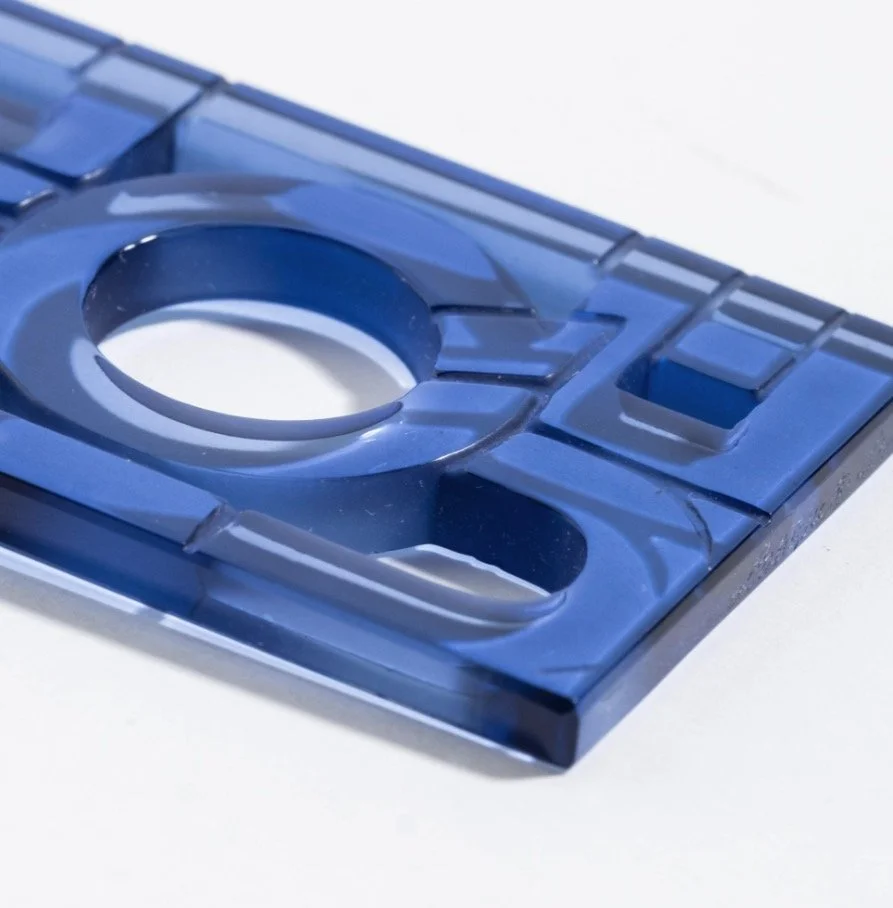 A Lalique pendant necklace featuring an amethyst blue etched molded art glass pendant, showcasing the iconic Lalique logo. Original Box. Signed on Edge Lalique R France.
