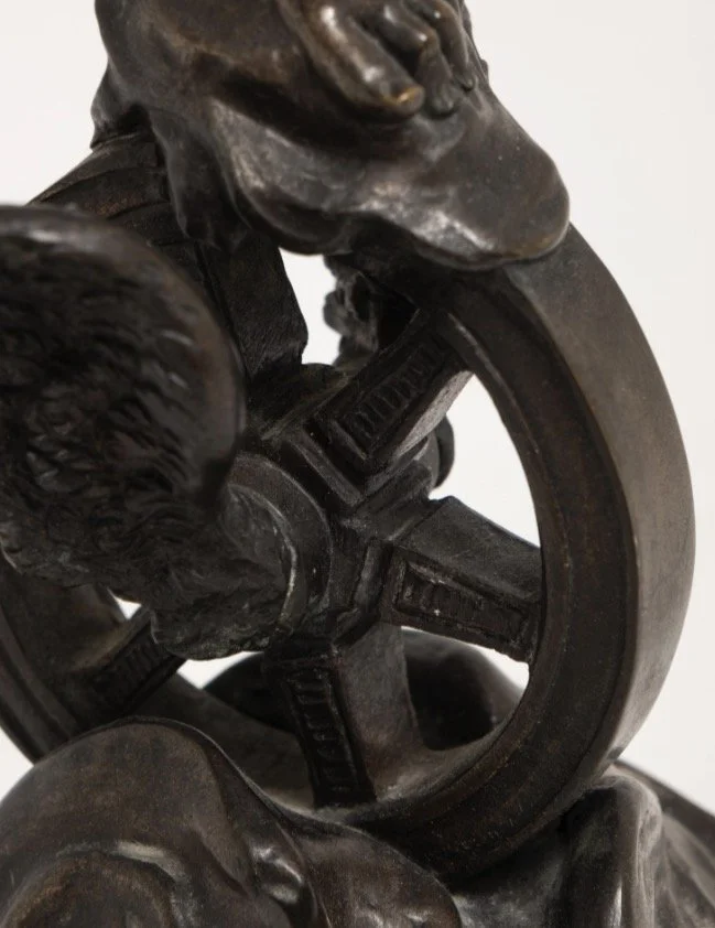 Bronze sculpture titled “Allegory of Fortune,” attributed to Louis Guillaume Fulconis (1818-1873) on a circular veined marble base. No apparent markings